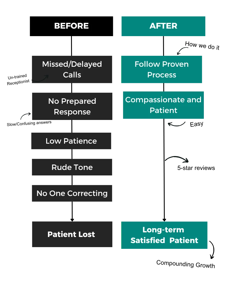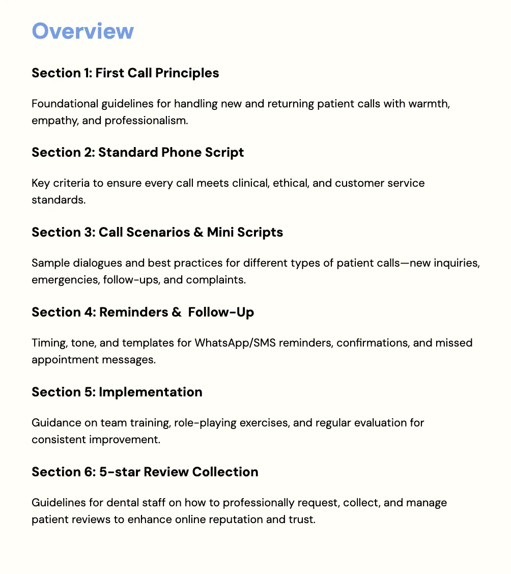 Call scripts for new, returning & emergency patients Complaint-handling language First-call checklist Real-world tone examples Reminder and follow-up message templates One-page SOP to hand to your team today