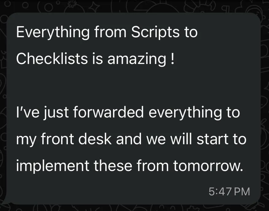 Within 5 minutes. It’s not a course. It’s a plug-in system. Print it. Brief your team. Watch your front desk level up in days — not months.